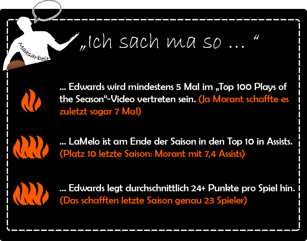 Wer diese Hausaufgaben in der spielfreien Zeit am besten erledigt hat, wird sich ab dem 20. Oktober zeigen, wenn sowohl die Hornissen als auch die Timberwölfe (?) in die neue Saison starten. Abgesehen von Defense (über die in diesem Text der Mantel des Schweigens gelegt wurde, obwohl beide gute körperliche Maße und Voraussetzungen haben): LaMelo hat wohl den “leichteren” Weg, seine Wachstumsbeschwerden abzulegen, wenn er körperlich und mental mehr Reife erreicht und aufs Parkett bringt. Edwards ist einen verlässlichen Jumpshot davon entfernt, NBA-Verteidigungen vor unlösbare Probleme zu stellen – doch viel häufiger als nicht materialisiert sich diese Hoffnung nicht. (Kawhi bleibt hier als strahlendes Beispiel nach wie vor die Ausnahme der Regel.) Doch bei den Fortschritten, die der Nummer-Eins-Pick in seiner Debütsaison gemacht hat, erscheint es unklug an Ant zu zweifeln. Trotzdem: Legt LaMelo eine 20/6/6-Saison bei solider Effizienz hin, würde meine ausgedachte Sophomore-of-the-Year-Trophäe wahrscheinlich nach Charlotte gehen. Dass Edwards etwas aufs Parkett brennt, was da konkurrieren könnte, spricht für das Talent beider Spieler.